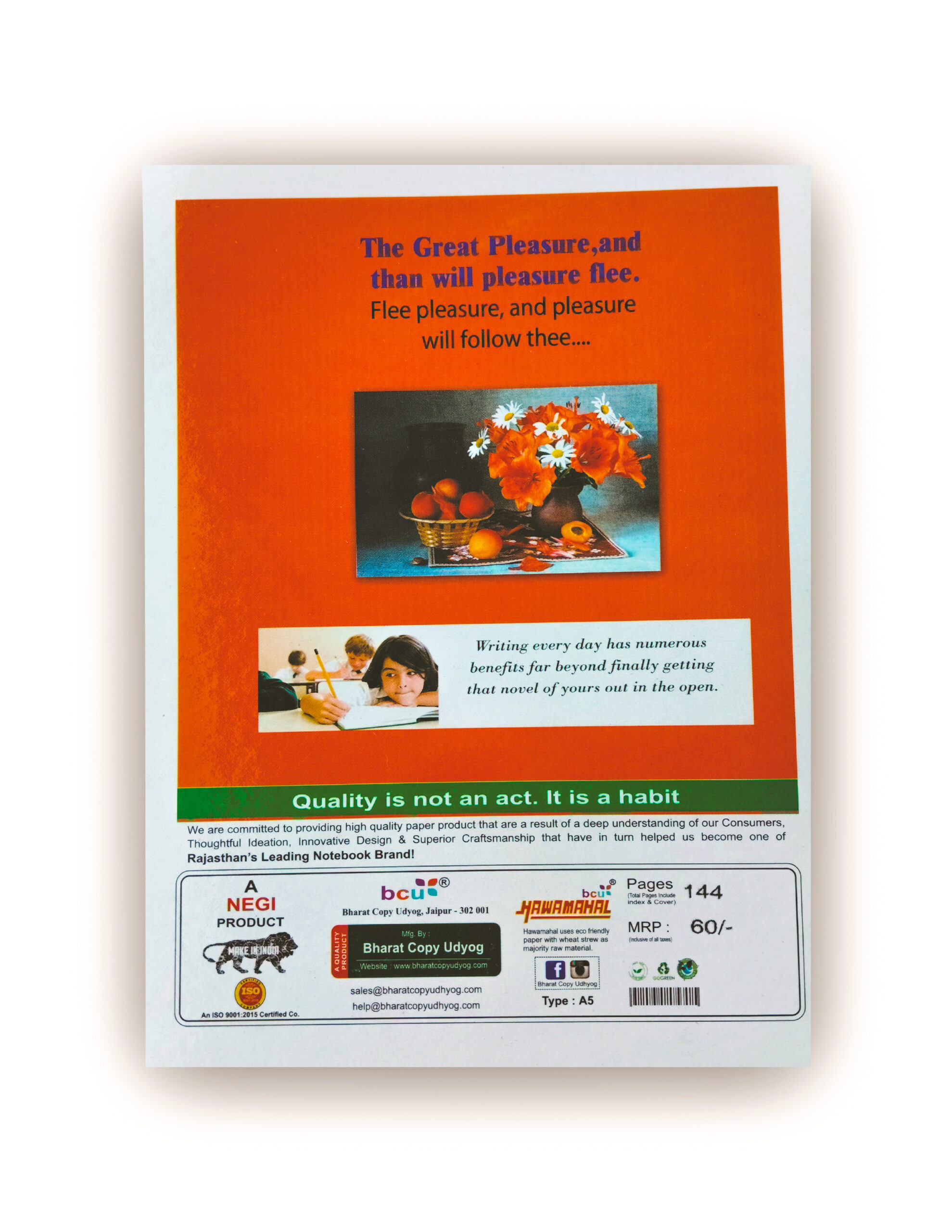 Highly resistive paper quality with solid binding ensure that you will never lose shape under extreme working conditions. Designed keeping in mind, for the people who likes to write in keepness and want their writing to be regular all-around the notebook i.e while making notes of classes, your daily office works or planning your personal day.